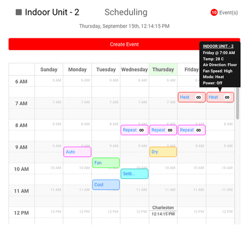 Set up weekly schedules for individual or multiple indoor unit groups. Schedule multiple events per day to improve comfort and system performance.